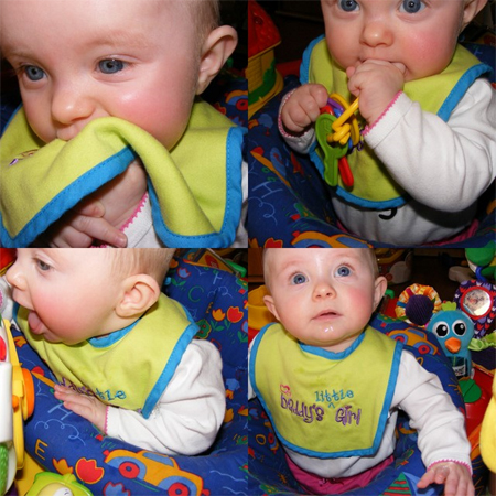 I did snap a few pics over the weekend of her in her activity saucer. Thanks to Grandpa, she likes it MUCH better now that she can stand up in it.