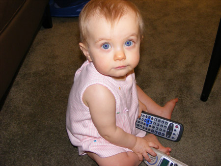 I’m sure if my pediatrician saw this post, she’d probably give me hell for this little Squirt and her tight grasp on the remote.