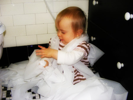 Fascination with the Toilet Paper Dispenser and Mad Housewrecking Skillz: you’re quickly earning your street cred as an efficient destroyer of all things tidy and neat. Don’t think for a second that I haven’t noticed you hungrily eyeing up that toilet paper dispenser for the past few weeks. I suspected you were preparing for your inevitable assault, and what absolute joy you would derive from denuding the single-ply sheets from their hapless cardstock core . That toilet paper roll might as well have a huge neon sign on it, garishly blinking “THIS IS AWESOME“. You. Were. Transfixed. I knew that I could police the bathroom all I wanted, but you are crafty and diligent and you would have your way with the toilet paper. OH YES. Now I have the video proof of your calculated and deliberate assailment and the satisfaction it brought you.