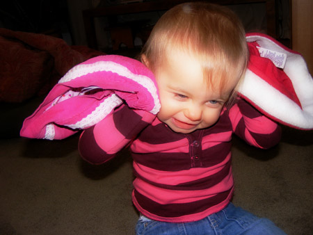 Speaking of books: this next bit will please the book-loving grandmothers that you have. Reese, I’ve never really seen a pre-toddler get SO into books as you have recently. I didn’t read to you earlier in your short life only because the only things that you seemed to enjoy was crying, CRYING LOUDLY, or getting boob. You were always kind of like “meh” and considered books to be in interesting only in the capacity that you could rip their pages out or throw them on the floor or put them in your mouth. Something this month has changed in you, and now… you don’t destroy the books anymore, but you review them over and over again. And your favorites (i.e. any of the “Peekaboo Baby” tomes) are ones that we will read several times a night before bed. You’ll pick out a book, drag it over to me, scramble up into my lap and proceed to look at each page. When finished with the fifth or sixth pass of said book, I try to introduce a new one but you push the new book away in protest, insisting Not this book! THAT book. THAAAAT BOOK!! GAAAH!! So, we’ll “read” your preferred book until I cannot manage the requisite sing-song “PEEKABOO” any more.